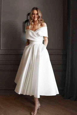 Элегантное блестящее свадебное платье ХАГГИС в длине миди - идеальный выбор для стильной невесты, которая хочетт быть яркой, ценит дезупречный силуэт, женственность и комфорт.
